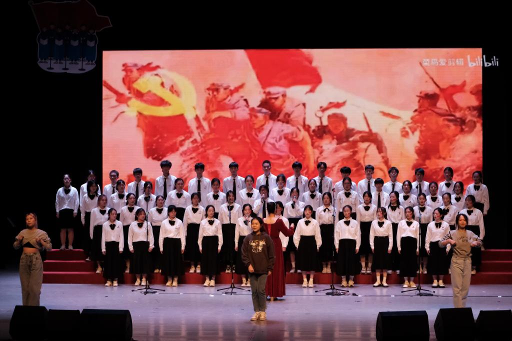 站于崭新的历史节点,吾辈青年应染泱泱华夏之风骨,手握明烛守本心,身怀热风担道义,涌青春后浪。承风骨亦有锋芒,有梦则刚,21会计3、ACA团支部带来的《最初的梦想》,展现青春热血,用嘹亮歌声奏响青春梦想。随后,21国贸1、国贸2团支部唱响《星辰大海》,中华民族希望的火炬,于一代又一代青年手中传递。歌声传递的力量,犹如点点微光,照亮前路。青年始终在中华民族伟大复兴的征程上占有重要地位,我们青年不忘初心、牢记使命,21经济2、经济3团支部带来的合唱《新征程》告诉我们青年应以梦为马、不负韶华,为祖国人民绽放青春之花。几番曲折,几番开拓,前进中经历了多少探索,一代又一代中国共产党人,继往开来,与时俱进,开创一条具有中国特色的社会主义道路,22应用经济学、管科物流、MBA团支部为我们带来歌曲《我们走在大路上》,纪念共产党革命先辈为如今盛世奠定的大路基石。