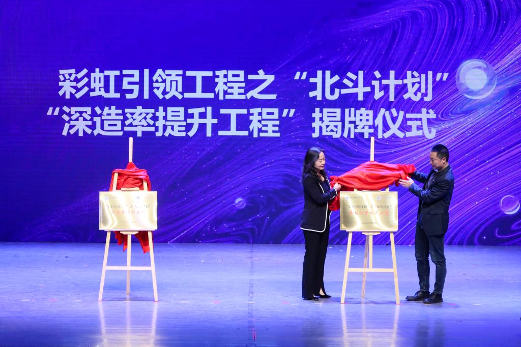 为提升彩虹引领工程育人实效,高起点、多元化、多层次提升本科生综合素质和高水平、高效益、新理念培养人才创新能力,会上,黄海蓉和李孝明分别为卓越人才培养工程启动仪式和深造率提升工程揭牌。李孝明代表公司聘请12位教师作为彩虹引领工程之“领雁计划”老员工创新创业导师。