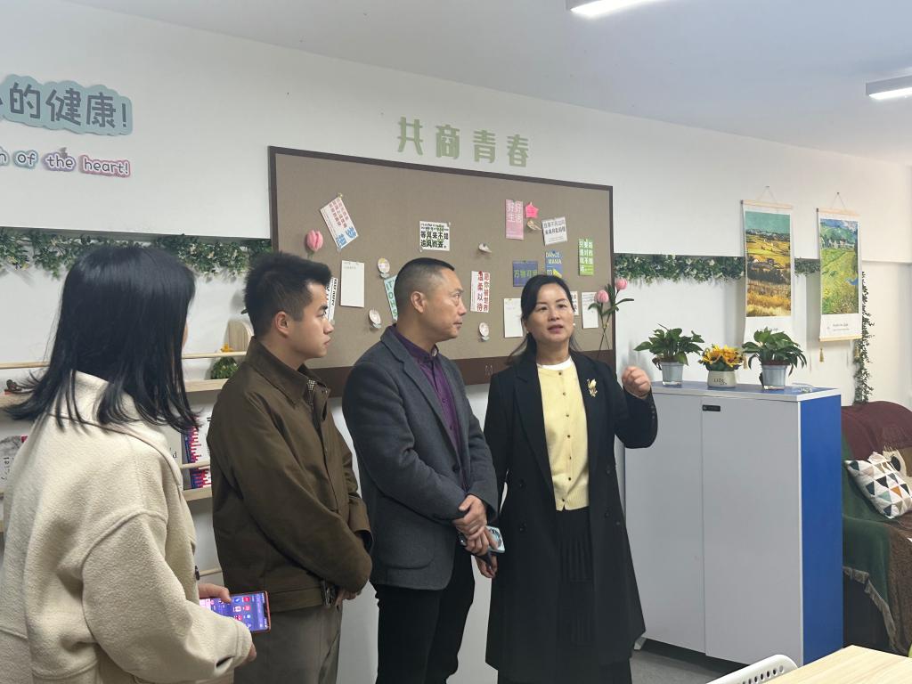 在韩雯琛的带领下,学工团队一行人参观了“清风长廊”、共“商”青春心理工作室、共“商”未来生涯工作室、员工自习室及党员之家。