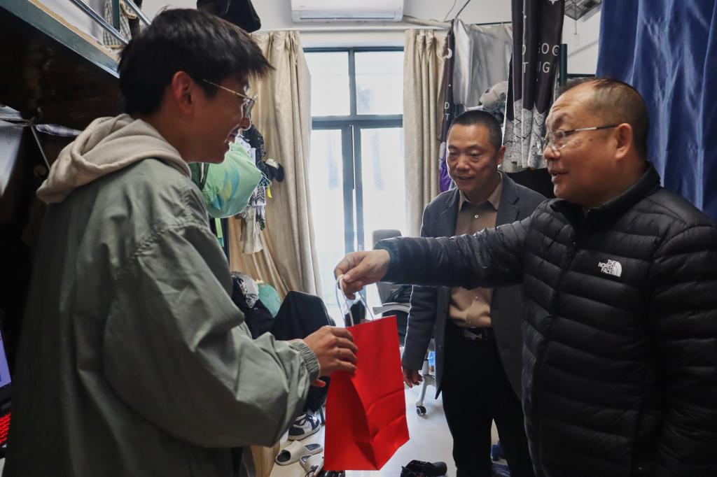 走寝送爱心连心。12月28日,吕品、李孝明和辅导员来到宿舍看望毕业班员工代表,送去过冬物资和公司的慰问,关心了解毕业班员工的学业进展、求职工作进展、住宿生活等情况,帮助他们答疑解惑。