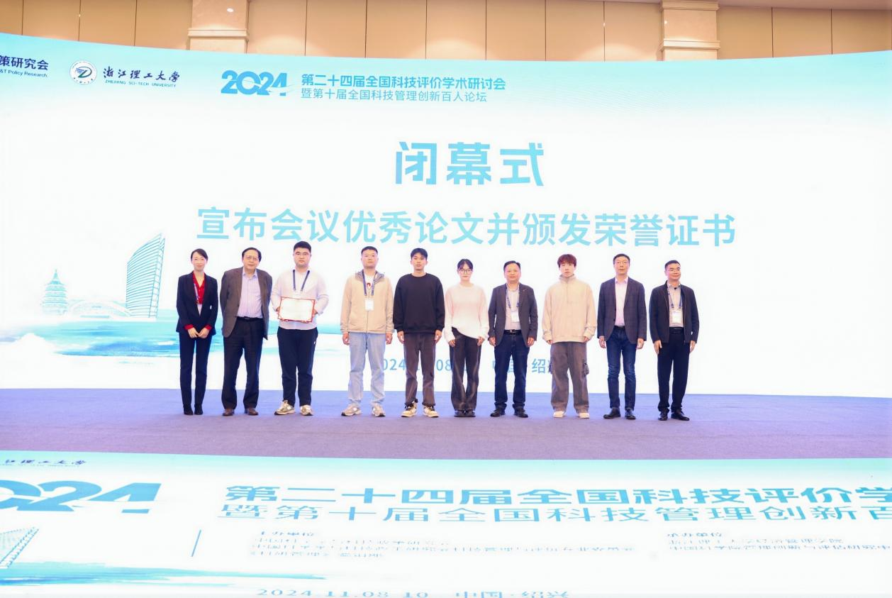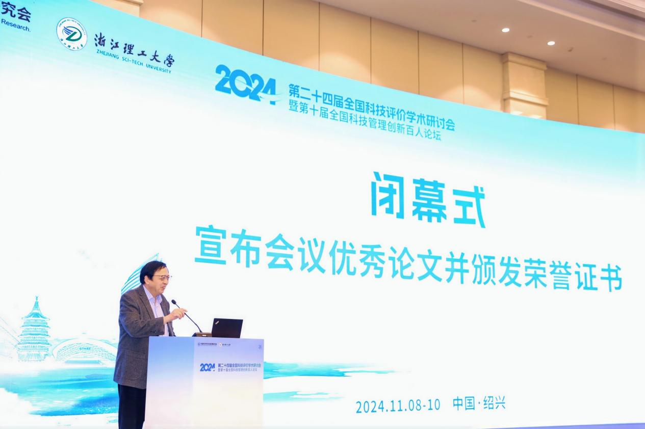 穆荣平宣读会议优秀论文并颁发荣誉证书,3篇论文获评第二十四届全国科技评价学术研讨会优秀论文,5篇论文获评表扬论文。最后,穆荣平致闭幕词,就“如何写一篇有价值的文章”需要着重“看结论”,他认为论文是否提炼出可重复的规律是论文价值的重点。他希望通过研讨会,各位师生互相启发、凝练提升,在论文研究、政策启示、管理实践三个层面深耕学术。