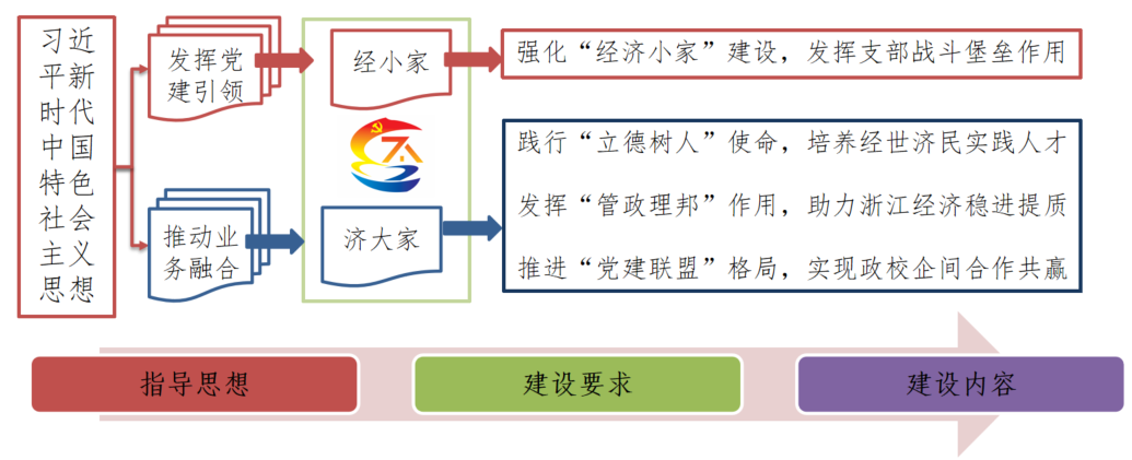 “经小家”是指“党建+小家”政治引领工作,充分发挥基层党支部战斗堡垒作用。“济大家”则以“党建+大家”服务发展模式,推动党建和立德树人、智库服务、政校企共建深度融合。其中,“经小家济大家”logo是结合“经”字变形融合党徽,“经”字右上角红色7.1表示“小家”核心地位,“经”字右下角蓝色“工”字表示“大家”扬帆起航。