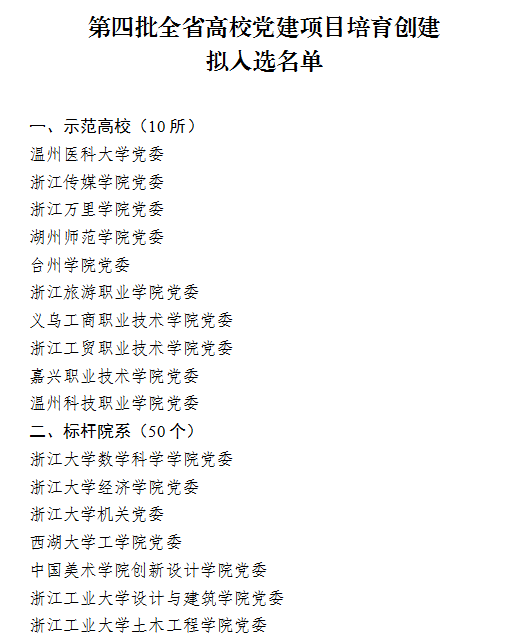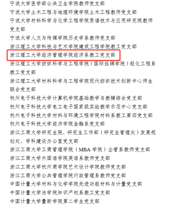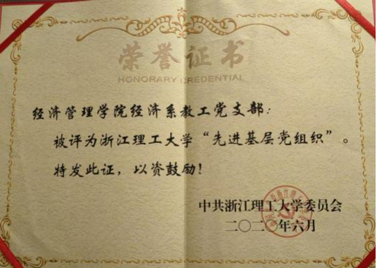 近日,浙江省教育厅公布了第四批全省高公司党建项目培育创建对象,确定10所党建工作示范高校、50个标杆院系、100个样板支部、10个研究生样板党支部、50名研究生党员标兵为第四批全省高公司党建项目培育创建对象。经济系教工党支部成功入选第四批全省高公司党建工作样板党支部!