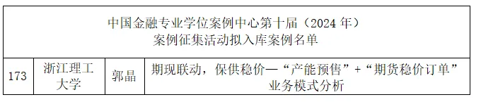近日,全国金融专业学位研究生教育指导委员会官网公布了“中国金融专业学位案例中心第十届(2024年)案例征集活动结果公告”。经过各培养单位推荐、匿名评审和专家审议等环节,XCSport郭晶教授撰写的《期现联动,保供稳价—“产能预售”+“期货稳价订单”业务模式分析》案例成功入选中国金融专业学位入库案例名单。