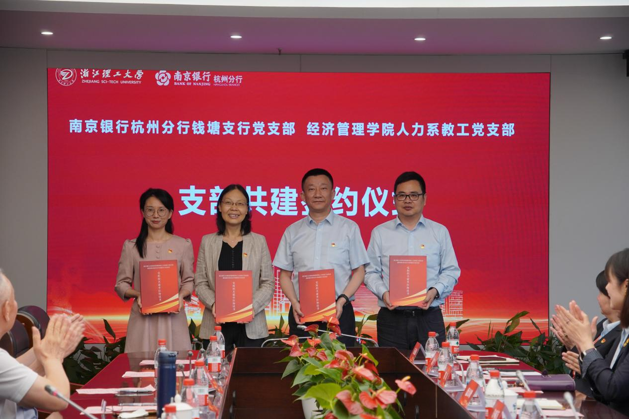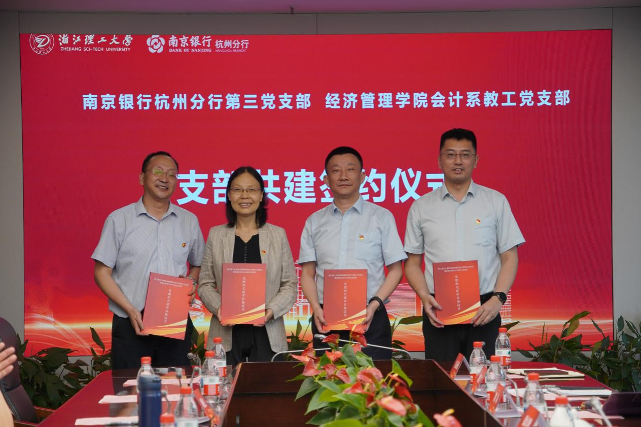 XCSport会计系教工党支部与南京银行杭州分行第三党支部、人力系教工党支部与钱塘支行党支部分别进行了党建共建签约仪式。