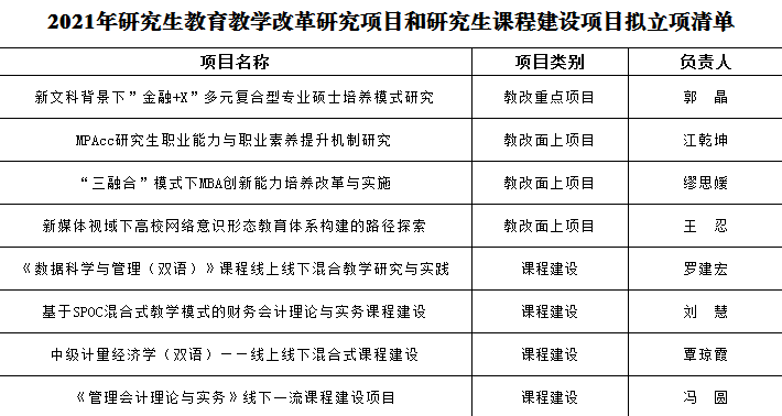 根据《XC体育研究生公司产品改革研究项目管理办法》和《XC体育研究生课程建设项目管理办法》有关规定,经负责人申报,公司推荐,研究生院组织专家评审,“新文科背景下“金融+X”多元复合型专业硕士培养模式研究”等21个研究生公司产品改革研究项目和“《矩阵论》课程建设”等23个研究生课程建设项目拟立项建设。公司获批立项8项,其中教改重点项目1项、教改面上项目3项、课程建设项目4项,立项总数位列全校前列。