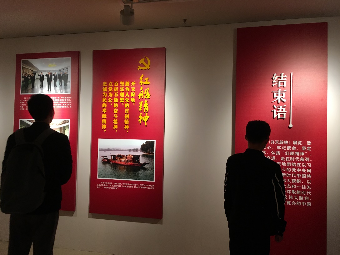 再沿着石阶向上便是纪念馆的主馆。在它的北方向山头,是高耸的英雄纪念碑。我们首先进入到纪念馆进行参观。主馆分为四楼,一楼是一字排开的小员工关于革命纪念主题的画展,二、三、四楼则是从鸦片战争开始到现代,我国历史、共产党历史和对近现代的一些浙江省英雄烈士事迹的展示。展示厅内通过图像、历史文物、文字和人物雕像的形式向我们介绍。