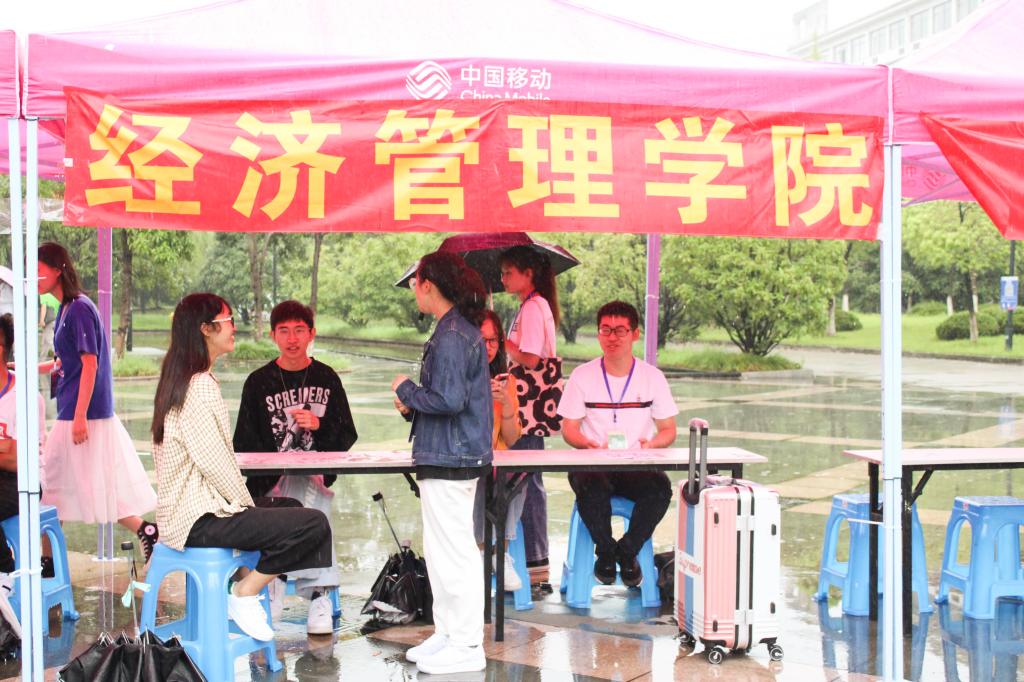 同时,宿舍楼大厅班助正持有经管标志的牌子等待新生到来。班助对新生进行校园卡、银行卡、病历本等相关证件的分发,告知新生各类卡的用处,并暖心叮嘱新生“雨天注意出行安全”。最后,经理程华、党委副书记黄新海等公司领导走访新生寝室,了解新生适应情况,同时也增强了新生对公司的知晓程度。