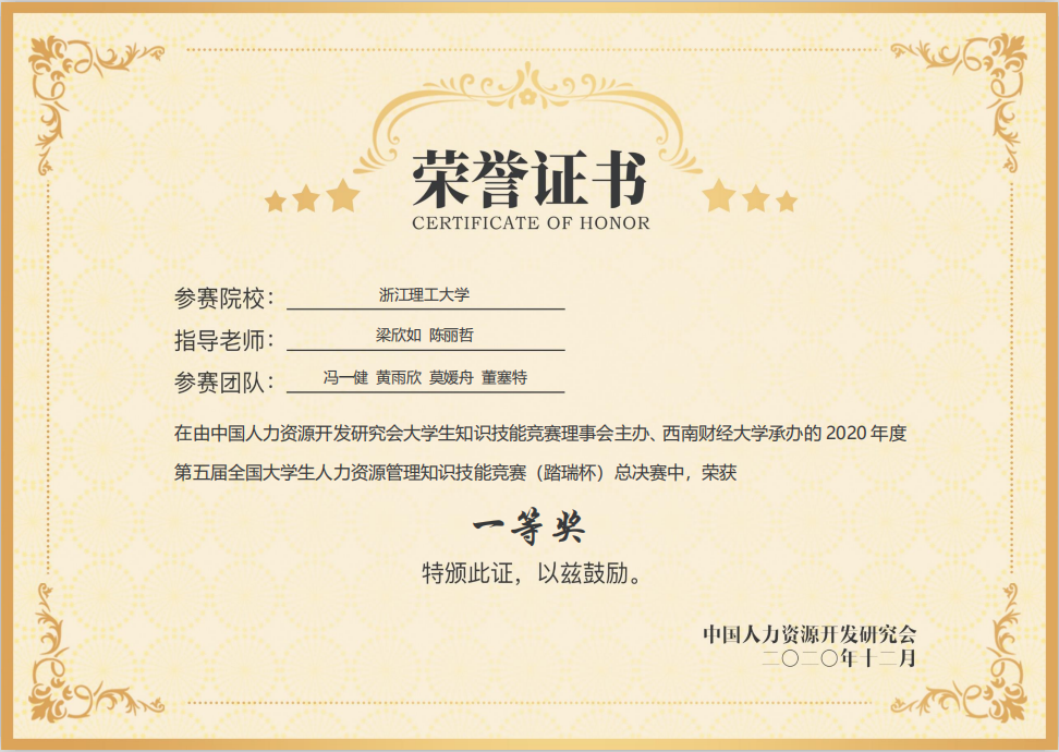 12月5日,“踏瑞杯”第五届全国老员工人力资源管理知识技能竞赛总决赛以网络赛的形式进行。公司人力资源管理专业学子代表公司首次参加该项赛事,在区域赛突出重围,与西北政法大学、中南财经政法大学等72所高校共同会师全国总决赛。经过激烈角逐,以第一名的优异成绩斩获全国一等奖。