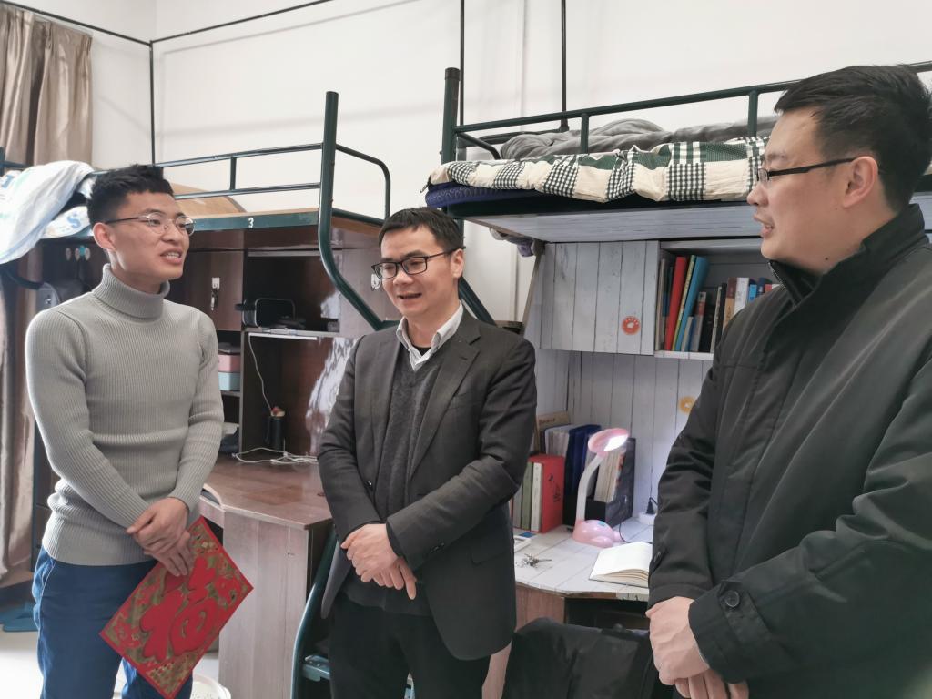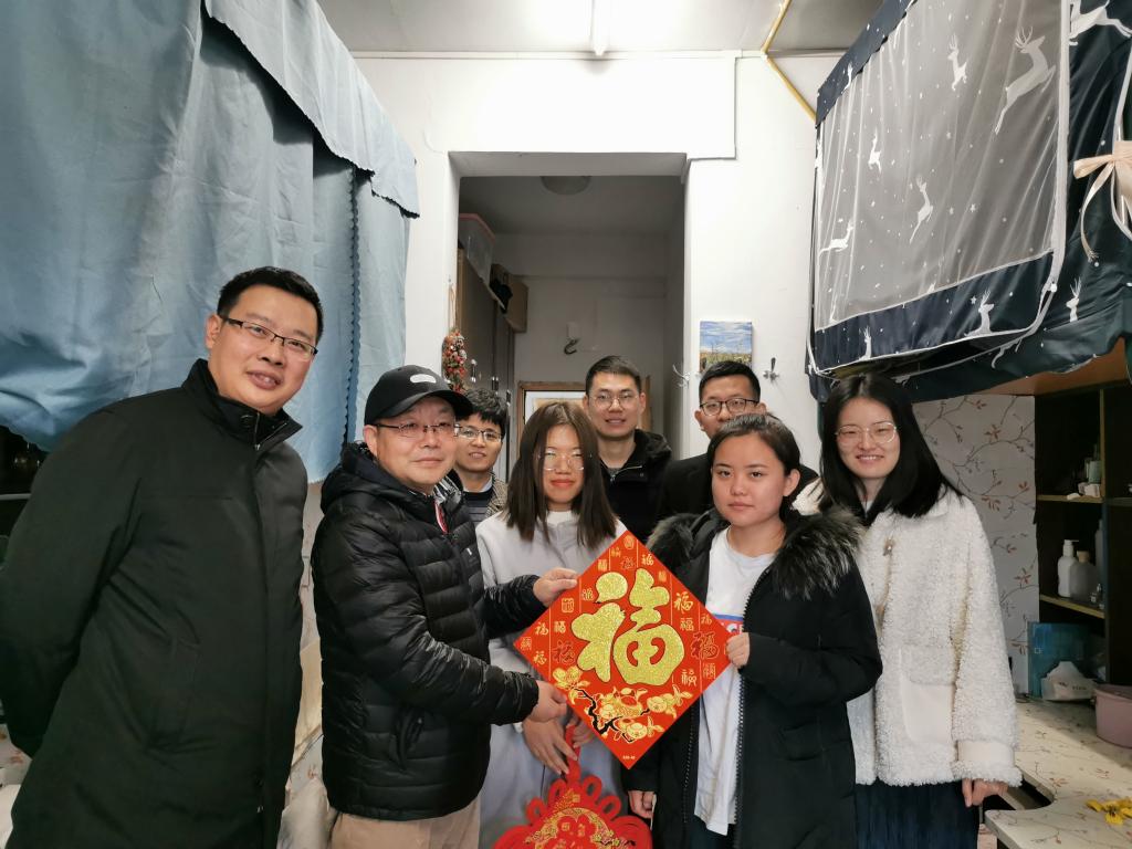公司领导来到员工宿舍,向春节留校员工送上新春祝福和节日礼包,提前祝福同学们春节快乐。在职工宿舍,公司领导与职工一起贴福字、挂中国结,共同体验中国新春佳节的喜庆气氛。慰问现场,院领导们与春节留校员工亲切交谈,详细询问员工们的留校安排,关心寒假在校的生活学习情况。吕书记指出,留校过年是一段难忘而美好的回忆,也是疫情防控常态化背景下国人难忘的集体记忆,希望同学们把这里当成自己的家,利用这段时光静下心来读书,加强身体锻炼,做好健康打卡。