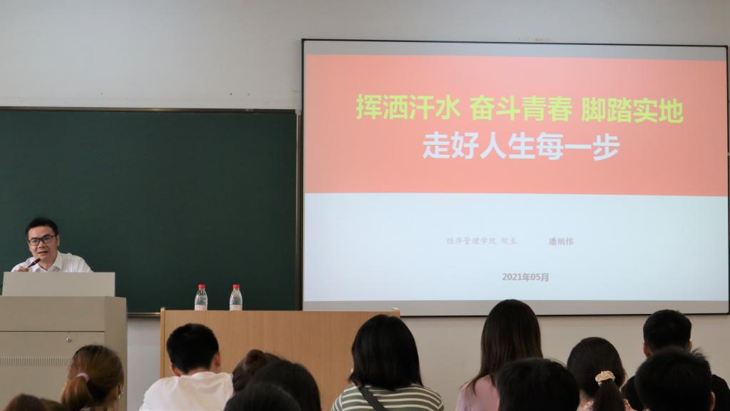 潘旭伟以自身经历为切入点,点明“踏实走好人生每一步”这一主题,从而引出脚踏实地走好人生每一步、奋斗青春聚力提升素养能力、挥洒汗水你我共进做“四个人”三点主要内容。潘旭伟强调要不断学习、脚踏实地,走好人生的每一步,“最大努力把当前工作做完美”“最大努力做一个值得信任的人”,并对预备党员提出三点要求:一是用心做事;二是公心处事;三是诚心待人。他表示,只有做到以德服人、以礼相待才能收获人心。