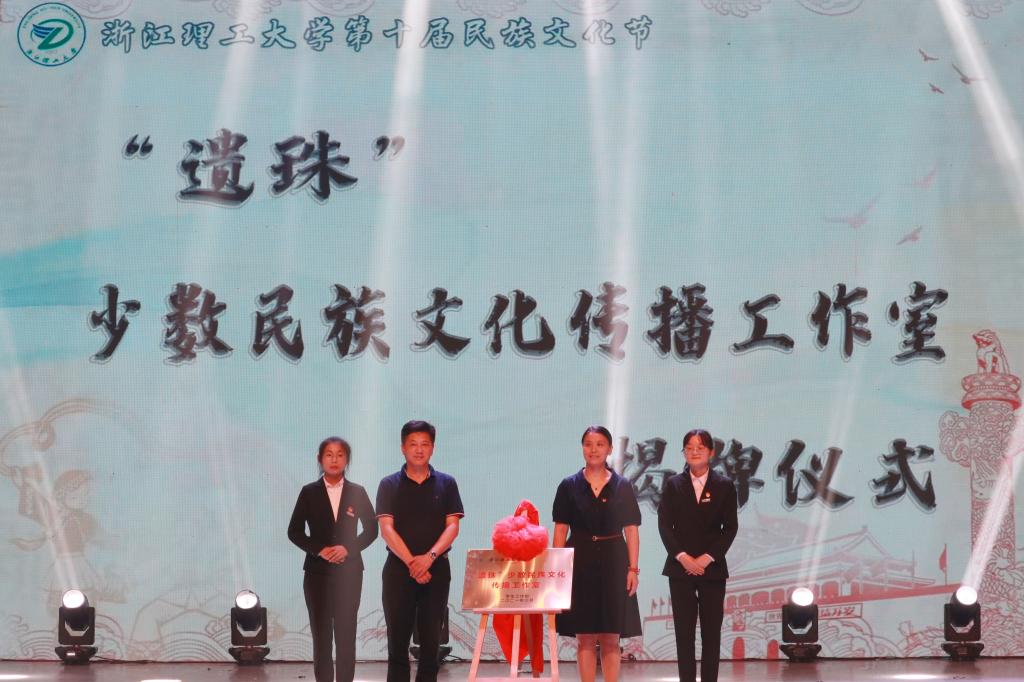 开幕式上,还举行了“遗珠”——少数民族文化传播工作室揭牌仪式,毛建翔和校员工工作部副部长汪小明共同为工作室揭牌。汪小明作为土家族教师代表,分享了她筹备“遗珠”工作室的缘起和初心。现场,各民族员工党员代表重温入党誓词,更加坚定了为共产主义事业奋斗终身的信心和决心。员工党员代表陈鑫分享了自己入党后的奋斗历程,号召全体同学牢记青年使命,勇担时代重任,放飞青春梦想。